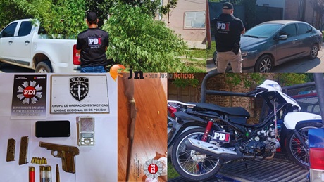 En el marco de dos causas por amenazas con arma de fuego, PDI San Justo realizó 8 allanamientos, como así también requisas, en zonas Este, Oeste y Céntrica de la ciudad secuestrando un automóvil, una motocicleta, una pistola, una escopeta, municiones, plantas de marihuana, celulares, vestimenta y otros elementos de interés.